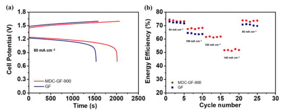 The performance for charge-discharge tests of single cells using (a) MDC-GF-900 and GF electrodes at 80 mA cm−2; (b) The energy efficiency (EE) of single cells with different electrodes at 80, 100, 120, and 140 mA cm−2.