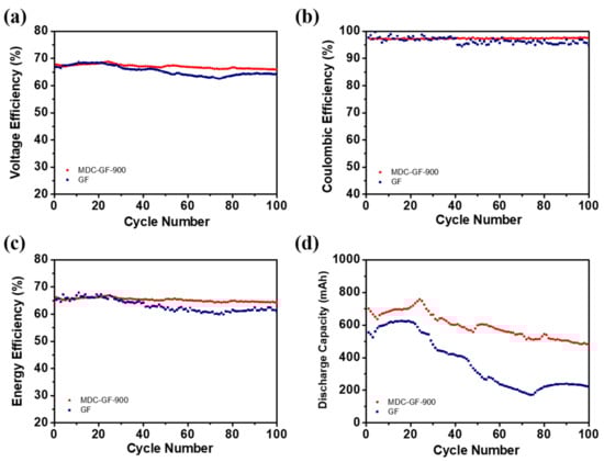 Figure 8b shows the EEs of VRFBs using MDC-GF-900 and pristine GF as cycle numbers at various current densities. Table 1 lists the VEs, the CEs, the EEs, and capacities of the VRFBs using MDC-GF-900 and pristine GF at different current densities. Firstly, for both VRFBs, the EE becomes lower as the current density increases because the polarization increases with increasing current density. Secondly, at 80 mA cm−2, the difference of EE between MDC-GF-900 and the pristine GF is only 1.3%, and MDC-GF-900 exhibits a more remarkable improvement of EE by 3.9% higher than that of GF at 100 mA cm−2, which is also comparable with previously reported ZrO2-based catalyst [39]. Furthermore, at 120 and 140 mA cm−2, the EEs of MDC-GF-900 still keeps 61.6% and 51.8%, respectively. However, the VRFB using the pristine GF is not able to show any results. Since the polarization of pristine GF is too high, it is challenging to conduct the charge-discharge process. Even in the last five cycles, as the current density returning to 80 mA cm−2, the EE of the pristine GF is about 1.8% lower than that of the first five cycles. Interestingly, on the other hand, MDC-GF-900 could perfectly maintain its EE as the current density returning from 140 to 80 mA cm−2. The superiority of MDC-GF-900 becomes even more substantial when the current density is further increased. The CE is affected by the battery or vanadium ions’ leakage through the membrane during the charge-discharge process. Therefore, the capacity can be considered the utilization of electrolytes for the VRFB. The capacities of MDC-GF-900 reveal 31% and 107% higher than those of the pristine GF at 80 and 100 mA cm−2, respectively. Even at 120 and 140 mA cm−2, MDC-GF-900 shows 356.9 and 70.2 mAh capacity, respectively, but the pristine GF cannot get any energy from the electrolytes during this situation. In other words, MDC-GF-900 improves the utilization rate of electrolytes and thus increases the capacity of VRFB. It represents the cost down of purchasing electrolytes for constructing and maintaining VRFB systems.