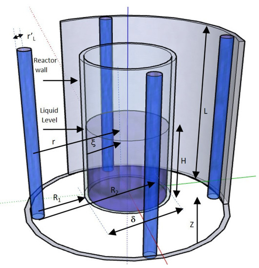 1. Dimension variables of the central lamp photoreactor are substituted by the corresponding variables of the same symbol or name of the external lamp photoreactor so that Figure 2 becomes Figure 1. For instance, the radius of the internal wall of the assumed photoreactor was R1, that is, the distance between the lamp and the wall of the actual external lamp photoreactor.