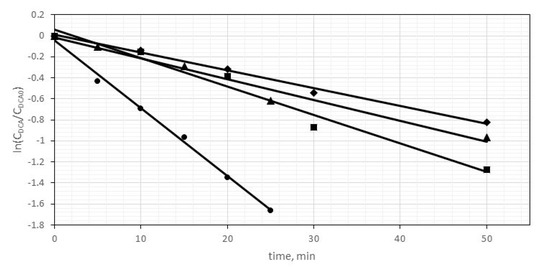 First-order kinetics for the photocatalytic oxidation of Dichloroacetic acid (DCA) (experimental data deduced from [21]). Initial DCA concentration, mgL−1: ⬤ 5; ■ 20; ▲ 50; ◆ 70.