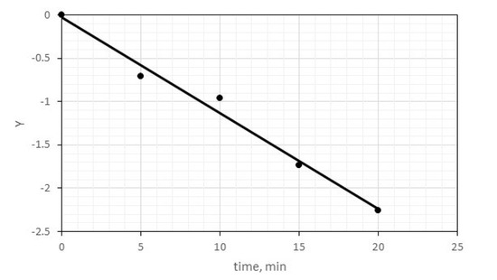 Figure 7 confirms Equation (21) for photocatalytic oxidation of MCPA, where the slope of the straight line after least squares fitting, as in Figure 6, also corresponds to −kM. It should be highlighted that values of kM for MCPA photocatalytic oxidation following both the Langmuir model and first-order kinetics are nearly coincident (0.1116 and 0.104 min−1, respectively). In the Supplementary section, the confirmation of Equation (19) of first-order kinetics for the case of MCPA is also presented. Accordingly, for MCPA, in spite of the non-negligible contribution of adsorption, first-order kinetics could be assumed as well.