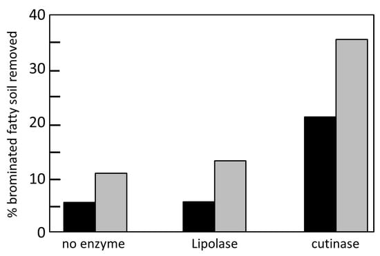 Percentage of fatty spots eliminated by Lipolase and the cutinase of F. solani pisi using the sequential washing system. Black column: incubation 1; gray column: incubation 2. Adapted from [59].
