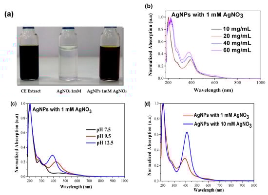 (a) A photograph of the CE extract, AgNO3 solution and AgNPs; UV-Vis spectra of the as-synthesized AgNPs with: (b) different extract concentrations and pH 12.5; (c) different pHs and 20 mg/mL of extract; (d) different AgNO3 concentrations (1 mM and 10 mM precursor solutions) with 20 mg/mL of extract and pH 12.5, incubation time of 1 h, and 40 °C of temperature.