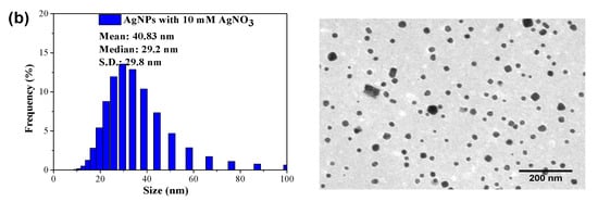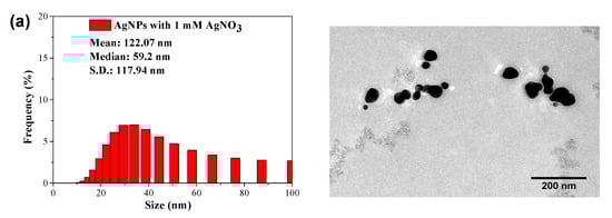 DLS (Dynamic Light Scattering) analyses were performed to evaluate the hydrodynamic diameter of silver nanoparticles (Insets Figure 2). Particle size of nanoparticles prepared with 1 mM AgNO3 solution (Inset Figure 2a) shows a wide distribution (122.7 ± 117.94 nm) whereas for the AgNPs prepared with the 10 mM AgNO3 solution (Inset Figure 2b), the size distribution is narrowed (40.83 ± 29.8 nm). Moreover, in Figure 2a,b, TEM analysis demonstrated that AgNPs prepared with 1 mM AgNO3 solution are multiform in shape (Figure 2a and look like forming agglomerates of particles. In contrast, AgNPs synthesized with 10 mM AgNO3, are fully square, circle and rod forms (Figure 2b) and show homogeneity.
