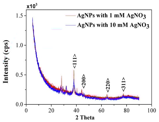 In Figure 3, the XRD (X-Ray Diffraction) pattern of AgNPs prepared with 1 mM AgNO3 solution (black line) shows reflection peaks at 37.96°, 44.09°, 64.32° and 77.29° corresponding to crystalline planes <111>, <200>, <220> and <311>, respectively while for the AgNPs prepared with 10 mM AgNO3 solution (red line), the diffraction angles are 37.93°, 44.18°, 64.47° and 77.16°. Results demonstrate that both types of AgNPs are linked to the crystalline planes of face centered cubic (fcc) structure of the silver metal and closely correlates to the reported reference values of the Joint Committee on Powder Diffraction Standards (JCPDS PDF no: 89-0713). These peaks are similar to those nanoparticles prepared by green synthesis using Shora [], Rosa hybrida petal [], cochineal [] extracts. The remaining diffraction peaks at 2θ = 28.23°, 31.54°, 40.44°, and 64.32° for the AgNPs synthesized with 1mM AgNO3 solution and 2θ = 27.58°, 32.02°, and 37.93° for the AgNPs synthesized with 10 mM AgNO3 solution, are difficult to directly attribute to the correspondent silver phase. However, these peaks can be related to silver oxide (Ag2O) and contaminants such as sylvine (KCl) and halide (NaCl) (see Figure S1), which are a common occurrence in plant-based synthesis [] and can be effectively removed by performing multiple washing cycles with deionized water.