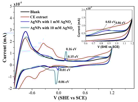 Figure 4 shows the cyclic voltammetry of the CE at a concentration of 20 mg/mL and two types of AgNPs (prepared with 1 mM & 10 mM AgNO3 solutions) within a range potential of −1.2 to 1.2 V. The extract exhibited a reduction peak at −0.53 V in the cathodic zone and two oxidation peaks are observed at −0.18 and −0.34 V in the anodic region in the aqueous medium. Moreover, the small potentials observed at 0.83 V for AgNPs prepared with 1 mM AgNO3 solution and 0.86 V for AgNPs synthesized with 10 mM AgNO3 solution in the anodic section (Inset Figure 4), are due to the oxidation of hydroxyl groups in the A-ring of the flavonoid molecule, as suggested by Zhang et al., 2011 []. The as-synthesized AgNPs at basic pH show low oxidation because bands of the extract were extinguished during the redox reaction. As a substitute, characteristic peaks of the silver band (Ag+) and Ag2O are observed at 0.15 V and −0.01 V for AgNPs prepared with 1 mM AgNO3 solution and 0.16 V, −0.06 V for AgNPs synthesized with 10 mM AgNO3 solution. Note that the existing value of the last Ag2O band is increased due to a larger ratio of precursor to extract. These byproducts may be resulted from the: (a) limited reducing power of the extract polyphenols (E0 = 0.3–0.8 V) [] to reduce Ag+ to Ag0 (E0 = −1.80 V vs NHE) [] and (b) alkaline pH used in the synthesis of AgNPs. Under an alkaline environment, the formation of AgOH is triggered [] that in turn decomposes into Ag2O due to the favorable energetics []. This tendency has also been reported during the synthesis of AgNPs prepared with the cochineal extract (Dactylopius coccus costa), in which the increase the band of Ag2O was due to a low volume of extract for the reduction of AgNO3 []. Furthermore, the energy gap and ionization potential of the green synthesized AgNPs using the CE were estimated using optical and electrochemical techniques []. Based on the maximum potentials (0.83 V for AgNPs prepared with 1 mM AgNO3 and 0.86 V for AgNPs synthesized with10 mM AgNO3), the HOMO and the LUMO energy levels were determined (Table 2).