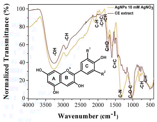 FTIR patterns of the dried CE extract and the AgNPs synthesized using 10 mM AgNO3 and chemical structure of the CE molecule.