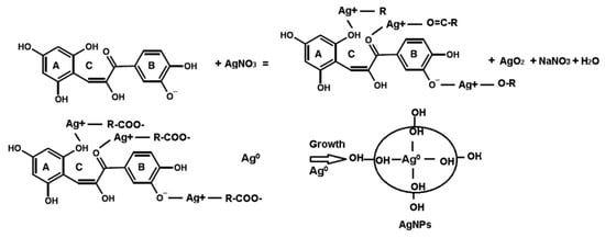 In the green synthesis process of AgNPs, using the extract of Carrasquilla fruit as reducing agent, it was observed there was a blue shift of the absorption peak when the pH of the extract was raised to 12. This phenomenon is likely due to the breaking of the C-ring, formation of a C=O bond and a hydroxyl; while in the B-ring there is an O− in the 5′ position of the anthocyanins, a phenolic compound that is a main component of the Carrasquilla fruit []. During the formation of AgNPs, the C=O group forms a complex with Ag+ and then is oxidized to COO− at the same time Ag+ is reduced to AgNPs (Figure 6).