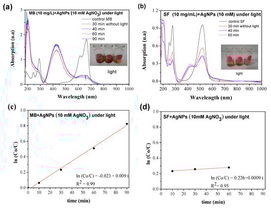 Degradation of: (a) MB and (b) SF dyes assisted by AgNPs prepared with 10 mM AgNO3 solution, (c) Linearized first-order kinetics for the MB and (d) for the SF, treated with AgNPs prepared with 10mM AgNO3 solution.
