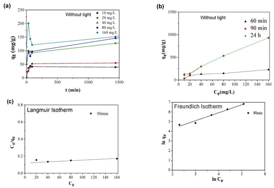 Adsorption isotherms were conducted under dark conditions using 160, 80, 40, 20, 10 mg/L of the MB with 2 mg of AgNPs, while the same concentrations of the SF were used with 0.5 mg of AgNPs. Samples were placed in a rotor (Heidolph Unimax 1010) at 40 rpm. Aliquots of 200 μL were taken after 60, 90, and 1440 min of treatment and analyzed in the spectrum Specord S-600. For the adsorption isotherm tests, Equation (5) was used to calculate the adsorption of the dye at equilibrium, qe (mg/g) []. All tests were conducted by triplicate.