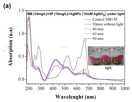 Lastly, Figure 9a showed the spectrum of the control sample (SF + MB) and the mixture of both dyes treated with AgNPs under simulated solar irradiation. Two main peaks at the wavelengths of 664 nm for MB and 518 nm for SF were clearly observed. Evidently, as seen in Figure 9a, without adding AgNPs, there was no reaction of any dye as reported by Sonawane et el. 2017 []. Furthermore, the degradation of MB and SF is similar to the profile obtained when both dyes were independently studied. Visually, it was observed that there was no change in the purple color of the initial mixture of both dyes but the intensity was less after treatment, implying there was no chemical transformation but only adsorption of the dye on the surface of the AgNPs similar to the SF individual tests. A second-order kinetics model fitted more accurately the results of the simultaneous degradation of both dyes. Change in the order of the reaction for this test compared to the individual ones carried out with each dye can be attributed to the increase of the solution concentration.