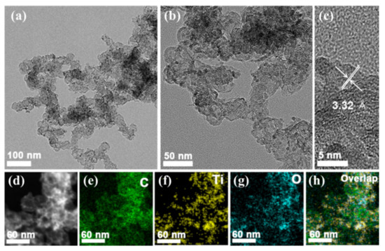 (a,b) TEM images of TiO2-SP at different magnifications. (c) HR-TEM image of TiO2-SP. (d) HAADF-STEM image and (e–h) the corresponding EDS elemental mapping images of TiO2-SP.