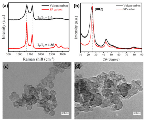 Figure 2c,d shows the TEM images of SP carbon and XC-72, respectively. Both of these materials are formed by the aggregation of carbon structures with a diameter of ~20 nm, and SP carbon has a spherical morphology with a graphitic structure in Figure S2. In the X-ray powder diffraction (XRD) patterns shown in Figure 2b, both samples exhibit peaks at approximately 25.0° and 43.6° that correspond to the (002) and (101) reflections of the carbon materials, respectively. The (002) peaks for the SP carbon and Vulcan XC-72 appeared at 25.3° and 24.8°, respectively. The SP carbon is closer to the graphite peak at 26.7°, indicating that SP carbon has a graphitic structure. Thus, the XRD, Raman, and TEM results indicate that SP carbon has a graphitic structure.