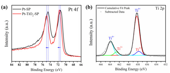 X-ray photoelectron spectroscopy (XPS) was performed to investigate the chemical oxidation states of the elements and the catalytic properties of hybrid materials. The curve fittings of Pt 4f XPS for Pt-TiO2-SP and Pt-SP, and Ti 2p for Pt-TiO2-SP are shown in Figure 5a,b, respectively. In the Ti 2p XPS spectrum of Pt-TiO2-SP, the two peaks at the binding energies of 458.2 and 463.9 eV with a splitting width of 5.7 eV are assigned to Ti 2p3/2 and Ti 2p1/2, respectively; they indicate the chemical state of Ti4+ in anatase TiO2 [2,27,28]. The Ti 2p peaks are slightly shifted toward higher binding energies compared to those of TiO2 (at binding energies of 458.7 and 464.4 eV). Additional fitted peaks for Ti3+ are observed in Ti 2p and in the survey spectrum (Figure S4). These are related to the partial reduction of titanium cations. These results indicate the presence of strong interactions between TiO2 and carbon as well as Pt. The Pt 4f XPS spectra of Pt-TiO2-SP and Pt-SP show two peaks corresponding to Pt 4f7/2 and Pt 4f5/2 of Pt(0). The Pt(0) peaks in Pt 4f XPS of Pt-TiO2-SP are shifted to higher energies by ~0.5 eV compared to those of Pt-SP, which is attributed to an increase in the vacancy in the 5d valence band orbital of Pt. These results provide further evidence for the SMSI between Pt and TiO2 in Pt-TiO2-SP [3,12,14,15,16,17,29].