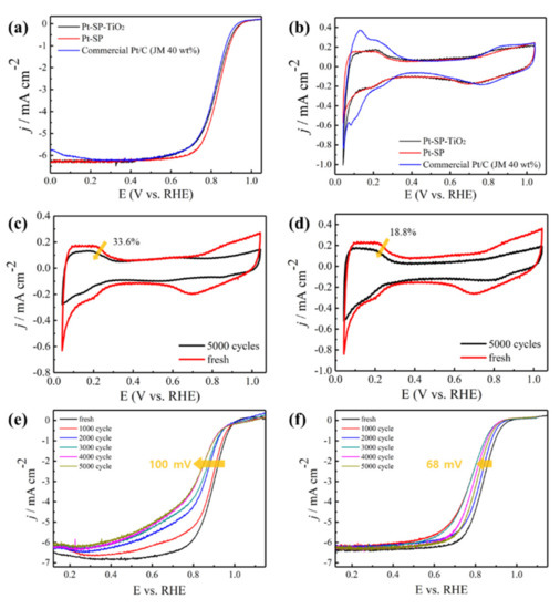 Electrochemical measurements were performed to evaluate the catalytic performance of the Pt-SP and Pt-TiO2-SP catalysts. Figure 6b shows the cyclic voltammetry (CV) curves of the Pt-TiO2-SP, Pt-SP, and commercial Pt/C catalysts at 50 mV s−1 in the scanning range of 0.05–1.0 V (vs. reversible hydrogen electrode, RHE) in N2-saturated 0.1 M HClO4. The ECSA values were calculated from the peak areas of the CV curves in Figure 6b using Equation (1). The ECSA indicates the electrocatalytic behavior due to the adsorption and desorption of hydrogen atoms, and was determined by integrating the CV curve between 0.05 and 0.4 V. The effective masses were obtained based on the inductively coupled plasma results that revealed the presence of 34 wt.% Pt in Pt-TiO2-SP and 36 wt.% Pt in Pt-SP. The Pt-TiO2-SP catalyst exhibits an ECSA of 66.1 m2 g−1, which is higher than those of Pt-SP (52.0 m2 g−1) and Pt/C (58.9 m2 g−1).