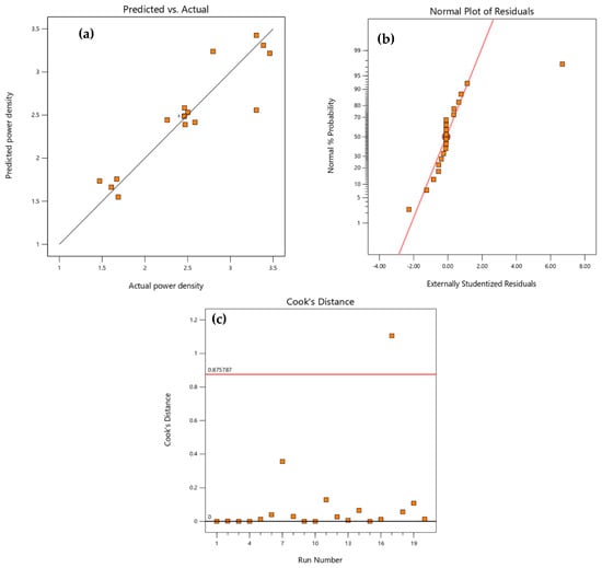 Based on the control variables and their respective response values (Section 3.4), a linear polynomial function was developed to predict the power density. The coefficients of the model were estimated by using the RSM in Design Expert software, at a confidence level of 95%. Equation (1) represents the analytical function to predict the power density, based on the three-selected control variables.