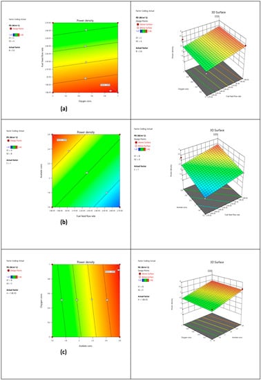 After verifying the validity of the model, the next step was to interpret the results and find the optimal design points. The developed analytical model was used to generate contour plots and response surface plots against the control variables to study the effect of independent parameters on power density. An understanding of the interactions of variables is essential for achieving the highest power density. The three-dimensional response surface helps in the visualization of the interactions between the variables. However, for simplification, contour plots can also be used. Figure 2 depicts the contour plots and the 3D response surfaces for the interaction between power density, acetate concentration, oxygen concentration, and fuel feed flow rate.
