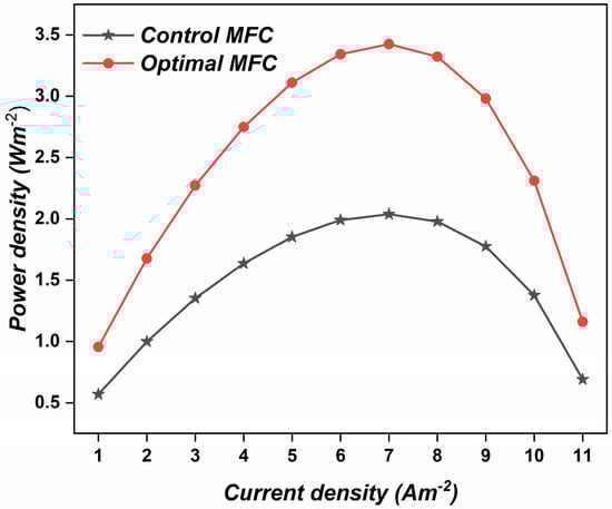 The optimal conditions recommended by the numerical model have been highlighted in Table 1. The statistical model, Equation (1), predicts that under the mentioned optimal conditions, the power density must be 3.425 W·m−2. In order to validate these optimal results, a comparative study was conducted in which the power density of the control MFC was compared to that of the optimized MFC (see Figure 3). The control cell was operated at a fuel feed flow rate of 2.25 × 10−5 m3·h−1, an influent acetate concentration of 1.56 mol·m−3 and an influent oxygen concentration of 0 mol·m−3; whereas, the optimized MFC was operated at the proposed optimized conditions. All the experiments were performed at least twice and average values are stated. On average, a marginally insignificant value of deviation (2%) was observed. It was observed that the optimized MFC produced a much higher power density compared to the control MFC. Hence, the objective of the study was achieved. The obtained results, when compared to the literature, revealed that the maximum power density reported in an earlier study with the same experimental setup, but without optimization, was 2.039 W·m−2 []. Therefore, it is evident that, because of the optimization, an open circuit maximum power density of 3.425 W·m−2 could be achieved in the present study, with an average deviation of 2%.