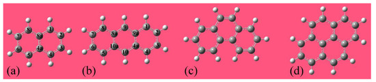 Polycyclic aromatic molecules found in zeolites. (a) Naphthalene, (b) anthracene, (c) phenanthrene, and (d) pyrene. For naphthalene and anthracene, the IUPAC numbering scheme of the carbon atoms is also shown.