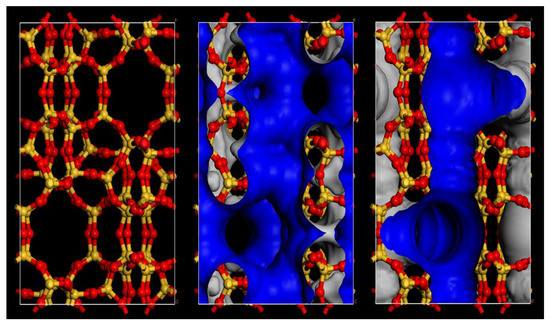 For Table 2, the zeolite structures [37,38,39,40,41,42,43,44,45,46,47] were obtained from the Inorganic Crystal Structure Database (ICSD) [67]. The accessible volume, as a fraction of the cell volume, is given by the IZA database [34] for each zeolite type and this was used with the structure to generate column 4 of Table 2. The Connolly method [35,36] (which rolls a sphere of a defined radius across the van der Waals surface of the structure to delimit the accessible volume) as implemented in BIOVIA Materials Studio [68], was used to generate columns 5 and 6 of Table 2, using sphere diameters of 1 and 5 Å, respectively. The limiting opening sizes (last two columns of Table 2) were obtained from the IZA database.