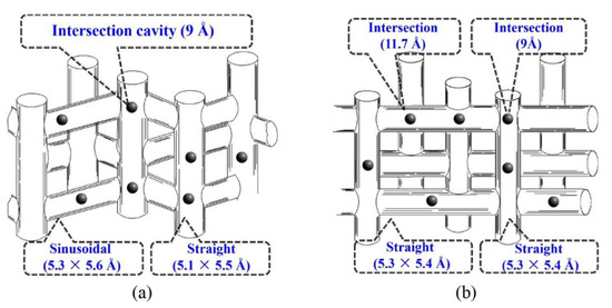 Comparison of the channel structure of (a) H-ZSM-5 and (b) H-ZSM-11. Reproduced from [57] with permission of the American Chemical Society.