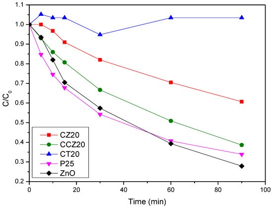 The photo-driven reduction ability of CZ20, CCZ20 and CT20 was compared to a lab-prepared nanosized ZnO and a commercial TiO2 (P25, Evonik), and it is reported in Figure S1 of SI. Samples were tested in gas phase in a CO2-rich environment both to favour the production of CH4 over the side formation of H2 and to maximized CO2 availability [32]. Results showed no CO2 photo-driven conversion for any of the Ce-containing composites, while both bare ZnO and TiO2 were able to produce CH4 in the tested conditions (Figure S1 of SI). The photo-oxidative properties of the samples were tested on MB degradation tests. Samples were tested in aqueous medium without the addition of salts to avoid side effects and to provide model conditions, in order to highlight the performance of the catalysts and facilitate their comparison. When exposed to light, the mixed oxides samples CZ20 and CCZ20 showed an effective catalytic activity over 1 h. However, the latter was still lower than bare ZnO, as shown by the evolution of the relative concentration C/C0 in Figure 1. CCZ20 showed higher catalytic performance than CZ20, while CT20 showed no photo-oxidative activity in the tested conditions.