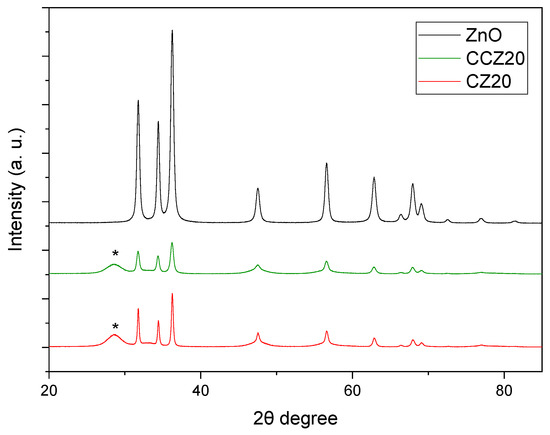 XRD analysis of CCZ20 and CZ20 samples revealed the characteristic pattern of wurtzite, with a hexagonal unit cell [10], confirmed by the peaks located at 32.1 (010), 34.5 (002), 36.5 (011), 67.1 (020), 68.5 (112), 69.9 (021) (Figure 2), as well as the presence of cerianite as cubic fluorite, identified by the star in Figure 2, and confirmed by the broadening of the ZnO peaks at 2θ = 47.79° and at 2θ = 57.16°, as already reported [27]. The Rietveld analysis for CZ20 and CCZ20 revealed a difference in the crystallite size of zincite, found to be 80 nm and 20 nm respectively, and attributed to the employment of different precipitating agents. Therefore, the presence of smaller CeO2 cubic fluorite crystallites (3 nm) dispersed in the ZnO structure (Figure 2) was hypothesized rather than the substitution of Ce4+ ions to the Zn2+ ones [33].