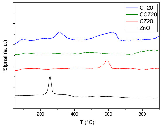 The result of the He-TPD analysis of samples is reported in Figure 9. The peak detected at 290 °C for ZnO was attributed to surface-adsorbed carbonates, as suggested by ATR analysis, released with the temperature increase [43]. The TPD of CT20 showed a similar peak at 310 °C, and two other detectable bands at 350 °C and 600 °C attributed to the release of adsorbed carbonates and to the temperature-dependent reduction of superficial Ce4+ state into Ce3+, with consequent O2 release. The band found at around 600 °C in CZ20 was related to the decomposition of organic residual, in accordance with FTIR results. Conversely, CCZ20 only showed a broad band above 700 °C, suggesting the possible presence of multiple adsorption sites with different binding affinity, as already suggested by ATR data.