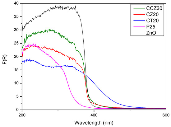 Results obtained by DRS were converted and plotted, as shown in Figure 11, using the Kubelka–Munk function F(R).