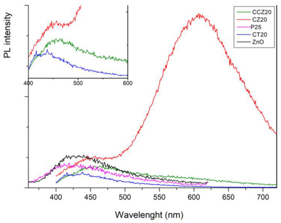 PL analysis showed a remarkable difference in the photoluminescence profile of CZ20, when compared to CCZ20 and bare ZnO, both in visible and UV emission. As already reported for ZnO [47,48], the broad band centred at 610 nm detected for CZ20 was attributed to a defect-related emission, with the high intensity likely reflecting the different size of ZnO-based nanostructures compared to the other samples (Figure 12). Besides the introduction of visible-emitting defects, it is also possible that the presence of surface-bound C-based compounds had a preferential passivating effect over the non-radiative emission upon recombination events. The low intensity band at around 430 nm for CT20 was attributed to the presence of CeO2, as similarly reported for bare CeO2 NPs [49], and this band was found to be red-shifted up to 460 nm for both CZ20 and CCZ20 (Figure 12). The presence of surface-related defects, as suggested by the broad visible band of CZ20, was related to the lower oxidative ability of the sample, when compared to CCZ20. In fact, the presence of intra states defects can result in recombination events, affecting the charge transfer and therefore the surface-related photocatalytic activity, as already reported [50,51].
