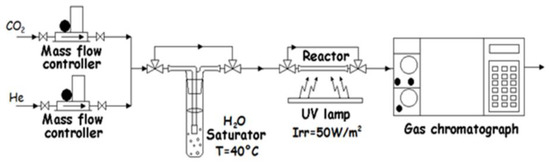 The photo-conversion of CO2 occurred in a flat-bottom borosilicate glass photoreactor (volume 2.8 cm3 and exposed surface 7.5 cm2). The catalyst dispersed in ethanol (Merck Life Science S.r.l, Milan, Italy) was spread on the bottom reactor while heating at 150 °C to obtain a homogenous film, alternating spreading and heating cycles until complete depletion of the dispersion. The reactor was then installed into a lab-made gas line [32] equipped with heated piping and a bubbler, in which a 13.3 CO2/H2O reaction mixture was generated by bubbling a CO2 flow (99.9%) into the bubbler filled with milliQ H2O, kept at 40 °C and monitored until a constant composition was reached. The gas output was analysed through a gas chromatograph (GC, HP 6890) equipped with a thermo-conductivity detector (TCD) and a Porapak Q packed column (Figure 13). The reactions were run by locking the stabilized CO2/H2O gaseous mixture within the reaction and by irradiating it for 6 h. The UVA light was generated through a UV lamp (Helios Italquartz, Milan, Italy). The light intensities were kept at 60 W/m2. These values were controlled through a Delta Ohm HD 2302.0 photo-radiometer equipped with an LP 471 probe for UV (315-400 nm) light.