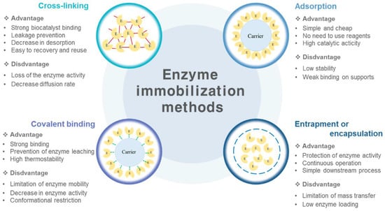 Unlike adsorption methods, enzymes are not straight located on their supporters’ surface in the entrapment method. Instead, they are physically trapped in the polymeric matrix, which allows the substrate and products to come and go with the hold position of the enzymes. This method can protect the enzymes from harsh environments and enhance stability. However, same as the physical adsorption, enzymes are physically confined in the polymer. Physical interactions are also relatively weak to prevent leakage completely without forming the chemical bond []. The encapsulation method can be considered as a type of entrapment method [].