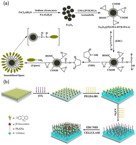 (a) The immobilization procedure of Fe3O4-poly(GMA-co-MAA) composite and subsequent immobilization of lipase onto the magnetic support []; (b) The scheme of immobilization of β-glucosidase and cellulase on low-density polyethylene [].