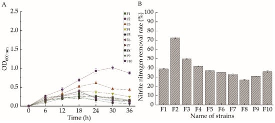 First, 5 mL of fresh sludge (Fujian DBN Aquatic Science and Technology Group CO., Zhangzhou, China) from the bottom of the aquaculture pond was transferred to a 250 mL conical flask with 100 mL of sterile water, glass beads were added, and the activated sludge was dispersed at 28 °C and 150 rpm shaking speed for 1 h. Then, the suspension in the 1 mL conical flask was transferred to a 250 mL conical flask containing 100 mL DM culture medium and incubated at 28 °C and 150 rpm with shaking for 36 h. After repeating enrichment three times, the suspension was picked up with an inoculating ring and scribed on a DM plate. After repeating isolation and purification three times, individual colonies were selected and inoculated in DM medium and incubated at 28 °C and 150 rpm under fermentation conditions. The removal efficiency of NO2−-N and TN in DM was measured separately to determine the aerobic denitrification ability of the isolates. Finally, 10 purified strains with aerobic denitrification ability were obtained by repeated delineation and determination of aerobic denitrification ability, and these strains were numbered F1−F10, then stored in storage tubes containing 50% glycerol in a −40 °C refrigerator. The strain with the highest TN removal rate was named F2.