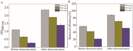 Variation of OD600 (A) and NO2−-N degradation efficiency (B) before and after the domestication of the strain F2.