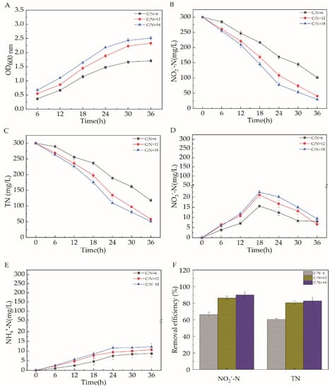 Nitrogen reduction-related values of strain F2 under different C/N conditions: OD600 (A), NO2−-N (B), TN (C), NO3−-N (D) and NH4+-N (E), under 36 h of growth; NO2−-N and TN removal efficiency (F).