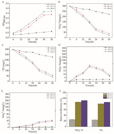 pH is an essential factor affecting microbial enzymatic activity, and most aerobic denitrifying strains prefer neutral to alkaline conditions. Low or high pH will affect the stability and charged state of enzymes and inhibit enzymatic activity. Low or high pH will also lead to hydrolysis and degradation of proteins and nucleic acids on the surface of microorganisms, affecting the uptake of nutrients by microorganisms and thus inhibiting their growth and metabolism [22,23].