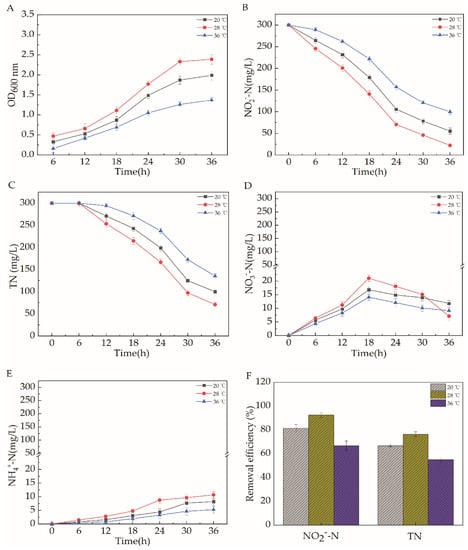 Nitrogen reduction-related values of strain F2 under different temperature conditions: OD600 (A), NO2−-N (B), TN (C), NO3−-N (D) and NH4+-N (E), under 36 h of growth; NO2−-N and TN removal efficiency (F).