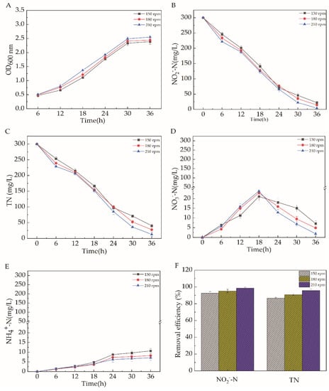 Dissolved oxygen affects the aerobic denitrification reaction process through the inhibition of denitrifying enzyme synthesis, activity, or competition with nitrate for electron donors and is essential for bacterial denitrification performance [30]. The concentration of DO directly affects the growth and denitrification activity of aerobic denitrifying bacteria, and the aerobic denitrification mechanism varies greatly among strains. Therefore, further studies are necessary [9]. In this work, the concentration of dissolved oxygen in the medium was altered by regulating the shaker speed, and the concentration of dissolved oxygen increased with the increase in the shaker speed. When the shaker speed was 150 rpm, the DO level in the culture medium was measured to be about 7 mg/L, and the DO content increased by 1 mg/L for every 30 rpm of shaker speed.