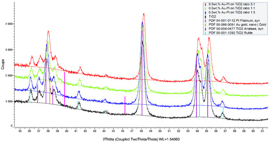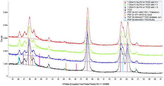 The XRD analysis was used to determine the morphology of the prepared catalysts. The results obtained for the bimetallic Au-Pt/TiO2 and Au-Pd/TiO2 catalysts with different metal loading and metal molar ratios are presented in Figure 1 and Figure 2.