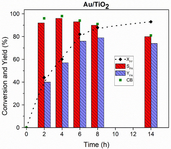 In addition, the effect of the reaction time on the oxidation of furfural from 2 to 14 h using the Au/TiO2 catalyst was studied. Figure 4 shows that the maximum selectivity towards furoic acid (96%) was obtained after 4 h with a maximum carbon balance (98%). Although selectivity and carbon balance decreased slightly along the reaction, an increase in the yield of furoic acid of 22% was observed, reaching a maximum of 79% after 8 h. However, the selectivity and the carbon balance started decreasing after 8 h, reaching a minimum of 80% and 81%, respectively, after 14 h, which suggests the degradation of FA with time. Taking these results into account, the reaction time of 4 h was chosen for further studies.