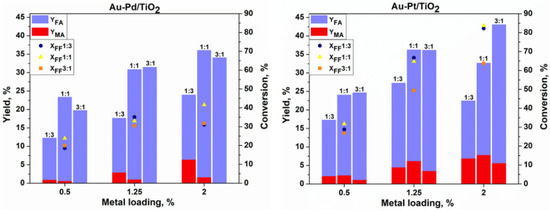 Taking into account the results presented above, and in order to minimize the FF degradation, further tests with bimetallic catalysts were performed at 80 °C and 4 h in a Screening Pressure Reactor. We studied the catalytic performance of the AuxPty and AuxPdy bimetallic systems supported on TiO2 with different molar ratios (1:3, 1:1, and 3:1) and metal loading (0.5, 1.25, and 2%) in the oxidation of furfural to FA and MA, and the results are presented in Figure 5. As expected, the oxidation of furfural using the bimetallic Au-Pd and Au-Pt catalysts at 80 °C gave better catalytic results than the monometallic gold, palladium, and platinum. Indeed, only 60% furfural conversion was observed for the Au/TiO2 catalyst after 4 h of reaction at 110 °C, and 29% at 80 °C.