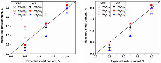 The Brunauer–Emmett–Teller (BET) analysis showed that different porosities were obtained for the tested samples. The BET surface area of the Au1Pd1/TiO2 and Au1Pt1/TiO2 samples were twice as large as that of the Au/TiO2 sample. The very low surface area of this catalyst is probably due to the pore blockage, as could be deduced from the significant decrease in the pore volume when compared to the TiO2 support. The differences between the catalysts were also observed in the ICP and XRF analyses (Figure 6).