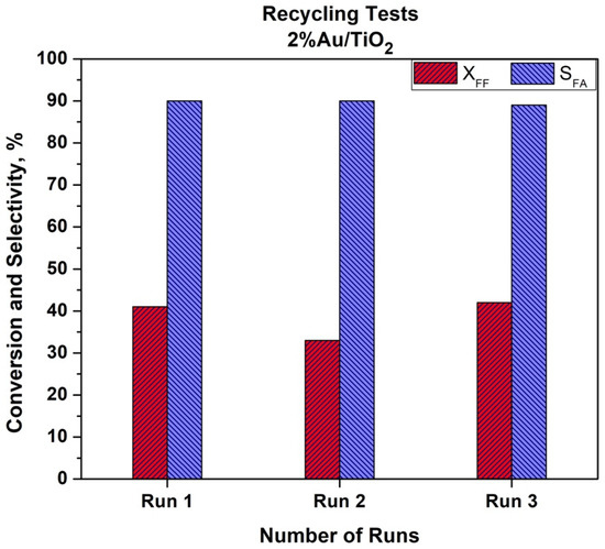 As can be seen from Figure 8, a slight decrease in the catalytic activity was observed. After the first run, a 20% drop in furfural conversion was observed. This drop was not confirmed after the third run when initial activity was achieved. This could be due to the problem with the catalyst recovery after the first test. The ICP analysis of the post reactant solution did not show a leaching of gold. We can also expect that a temperature of 110 °C is quite low to observe Au particle size growth. It is worth mentioning that selectivity to furoic acid remained both stable and high (90%) during the three recycling tests. More in-depth studies are in progress to study the recyclability and stability of the bimetallic catalysts in the batch and in the flow conditions.