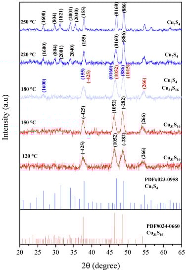 The phase structures of the as-synthesized nanoparticles at different reaction temperatures were investigated using XRD and presented in Figure 1. The temperature of synthesis of copper sulfide determines the composition and stoichiometry. In the samples obtained at 120 and 150 °C, the peaks at 2θ = 37.53, 46.31, 48.63, and 54.22 °C correspond to the (−4 2 5), (10 5 2), (−2 8 2), and (2 6 6) planes, respectively, of monoclinic djurleite Cu31S16 with a space group of P21/n (14) (JCPDS No. 034-0660) [34]. Our previous report involving the same complex but in oleylamine as solvent yielded pure phase covellite at lower temperature and digenite at higher temperature [35]. Similar studies involving the thermal decomposition of Bis(O-alkylxanthato)copper(II) in oleylamine showed the formation of djurleite (Cu31S16) phase as either an impurity phase or as the secondary phase. The results further showed the dependence of copper sulfide phases on the factors such as precursor type, growth temperature, and synthesis method used [36].