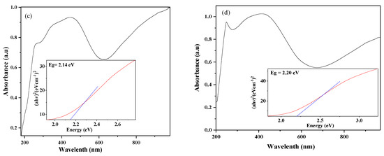 where hv is the photon energy, α is the absorption coefficient i.e., , and β is the band edge. The n value can be 2 or 0.5 for a direct or indirect transition, respectively [46]. The values for the optical band gaps were found to be 1.34, 1.38, 2.14, and 2.20 eV for Cu31S16 (120 °C), (b) Cu31S16 (150 °C), (c) Cu7S4 (220 °C), and (d) Cu7S4 (250 °C), respectively (inserts). These values are comparable to other similar studies [47,48] and also indicated a shift to a shorter wavelength compared to the band-gap energy of their bulks [44,49].