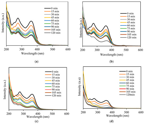 The photocatalytic degradation of TC solution using the pure phase samples (Cu31S16 (120 °C), Cu31S16 (150 °C), Cu7S4 (220 °C), and Cu7S4 (250 °C)) was conducted under the visible light irradiation. In the absorption spectrum of aqueous solution of TC, two absorption bands at approximately 275 and 360 nm are ascribed to the conjugated double-bond structures with two carbonyl groups and enolic groups, respectively [50]. The absorption spectra of tetracycline using Cu31S16 (120 °C), Cu31S16 (150 °C), Cu7S4 (220 °C), and Cu7S4 (250 °C) as catalysts are shown in Figure 5a–d respectively. The figure showed that the two phases of the copper sulfide nanoparticles, roxbyite-Cu7S4 and djulerite-Cu31S16, irrespective of their difference in synthesis temperature, have similar degradation patterns. During the photocatalysis processes, a non-sequential decrease and a slight shift of the absorption peak at greater wavelengths were observed with the increase in irradiation time up to 120 min. The two roxbyite phases exhibited greater catalytic ability than the djulerite phases, with 90% and 99% degradation for Cu7S4 (220 °C) and Cu7S4 (250 °C) respectively, which could be ascribed to the higher crystallinity of the roxbyite phase at 250 °C. The djulerite phases at 120 and 150 °C showed lower degradation percentages of 70% and 85%, respectively. Therefore, there seemed to be a direct relationship between the temperature and degradation efficiencies, and the degradation performance of these photocatalysts toward tetracycline molecules could be placed in the order Cu31S16 (120 °C) ˂ Cu31S16 (150 °C) ˂ Cu7S4 (220 °C) ˂ Cu7S4 (250 °C). In addition to the crystallinity, the higher absorption properties observed in the spectra of the roxbyite phases could be responsible for the higher photocatalytic activities [51] and faster mineralization rate compared to the djulerite phases [50]. Due to the high degradation efficiency of the Cu7S4 (250 °C), subsequent degradation experiments for further studies were limited to this phase.