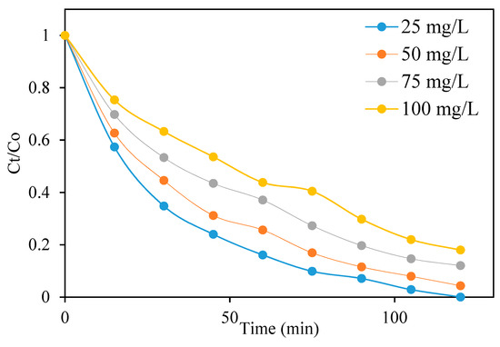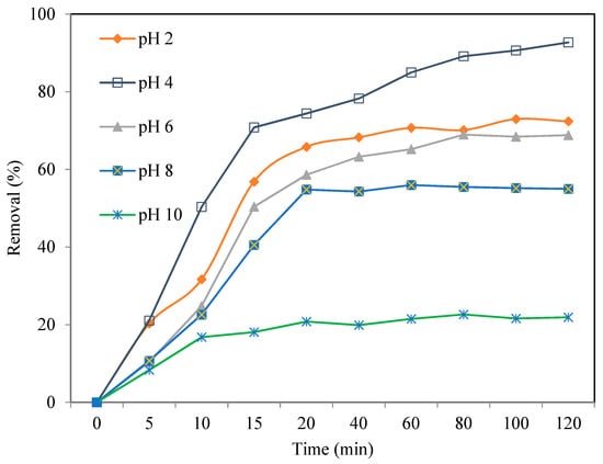 The initial pH of solution is one of the important parameters that influences the photocatalytic processes of compounds through the surface electrical charge characteristics of photocatalysts, and it dictates the ionization state of the catalyst surface. The effect of the solution’s pH was studied using 50 mg/L concentrations of TC, 80 mg of Cu7S4 (250 °C), and solution pH in the range of 2–10. Figure 6 presents the removal efficiencies at different irradiation times up to 120 min. The degradation efficiency obtained at pH 4 was 99%, while those obtained at pH 2, 6, 8, and 10 were 73.4%, 62.3%, 54.1%, and 46.7%, respectively. In addition, the outcome showed a decrease in percentage degradation of TC from 99% to 46.7% with the increase in the pH of the solution, indicating that pH 4 was the optimum [52]. Alkaline pH values (8 and 10) adversely affected the photocatalytic degradation of TC, resulting in a decrease in the removal efficiency up to 46.7%. The decrease in removal efficiency of TC in the alkaline pH range could be attributed to the concentration of hydroxyl radical, which was influenced by the solution pH. Perhaps the pH of the TC solution had a significant effect on the surface ionic speciation of the Cu7S4 and was able to control the reactants type and products obtained in the process. Similar results were reported by Ahmadi et al. [53], and Hao et al. [54] reported their studies on the photocatalytic degradation of TC using different photocatalysts. However, the influence of solution pH 2 on the degradation process was not very clear, because no direct trend could be established on the basis of the acidity and alkalinity of the solution [55].