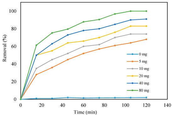 The degradation of TC was conducted under the visible light irradiation in the absence of the photocatalyst, and very little (3%) degradation of TC could be observed after 120 min reaction, as presented in Figure 7. The removal of TC using different catalyst loading at pH 4 and TC concentration of 50 mg/L under the visible light was conducted afterwards. An increase in the degradation rate constants with an increase in catalyst loading from 5 to 80 mg occurred, with about 99.1% and 25% degradation efficiencies achieved with 80 mg and 5 mg of Cu7S4 (250 °C), respectively. The increase in degradation of TC with increasing concentration of Cu7S4 (250 °C) in the solution could be ascribed to the increasing availability of more active sites, higher formation of OH, and increased effective interaction of the catalyst with the TC molecules. However, at a higher catalyst loading above 80 mg, most of the catalyst may suffer deactivation due to their accumulation, agglomeration, or precipitation, which could lead to a decrease in the available catalyst surface for light absorption and consequently result in a decrease in the degradation rate. Although catalyst loading above 80 mg was not investigated, Figure 7 shows almost 100% degradation of TC using 80 mg, indicating an optimal or equilibrium dosage for TC in this operating condition. These results were in accordance with some earlier reported studies involving the degradation performances of copper sulfide [56,57].