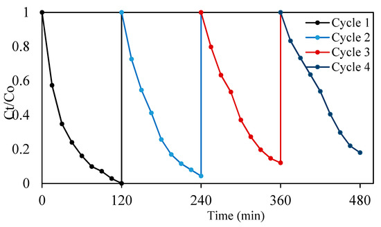 The effect of initial TC concentration on the removal efficiency of Cu7S4 (250 °C) was investigated and presented in Figure 8. The rate of degradation could be determined by the formation of hydroxyl radicals at any TC concentration. It could be observed that the removal efficiency of the photocatalyst decreased with increase in the initial TC concentrations from 5 to 25 mg/L after 120 min, which reflected the lower removal efficiency at higher TC concentrations. Thus, this implies that the rate of the TC degradation will decrease with the increase in the initial TC concentration, which could be due to the fact that the concentration of generated •OH on the surface of the photocatalyst will decrease as more TC ions cover the active sites of the photocatalyst. Furthermore, there will be an increase in the concentration of TC molecules adsorbed on the surface of the photocatalyst as the initial TC concentration increased. The high concentration of adsorbed TC resulted in an inhibitive effect on the reaction of TC molecules with photogenerated holes or hydroxyl radicals due to the lack of any direct contact between them [58]. The increase in internal optical density makes the solution become impervious to visible light, which is another reason for obtaining lower degradation efficiency at higher TC concentration. In addition, increasing the TC concentration, which led to the absorption of light by the TC molecules, could also hinder the photons from reaching the photocatalyst surface, thereby decreasing the photocatalytic removal efficiency [59]. The equal amount of reactive radicals formed in all concentrations might lead to an increased reaction of TC molecules with radicals at lower TC concentrations. This could also result in a decrease in the degradation [60]. The reusability of Cu7S4 (250 °C) was evaluated in order to determine its long-term use as a photocatalyst in the removal of TC. These experiments were conducted by repeating the degradation studies of TC using a solution of 25 mg/L. Figure 9 displays the recyclability of Cu7S4 (250 °C) for four cycles, and the results showed that the photocatalyst could be reused effectively after four cycles with little loss in activity. Thus, industrial application of this product is highly viable due to its reusability and stability properties. Similar results were reported in the studies related to the photo degradation of antibiotics [61,62].